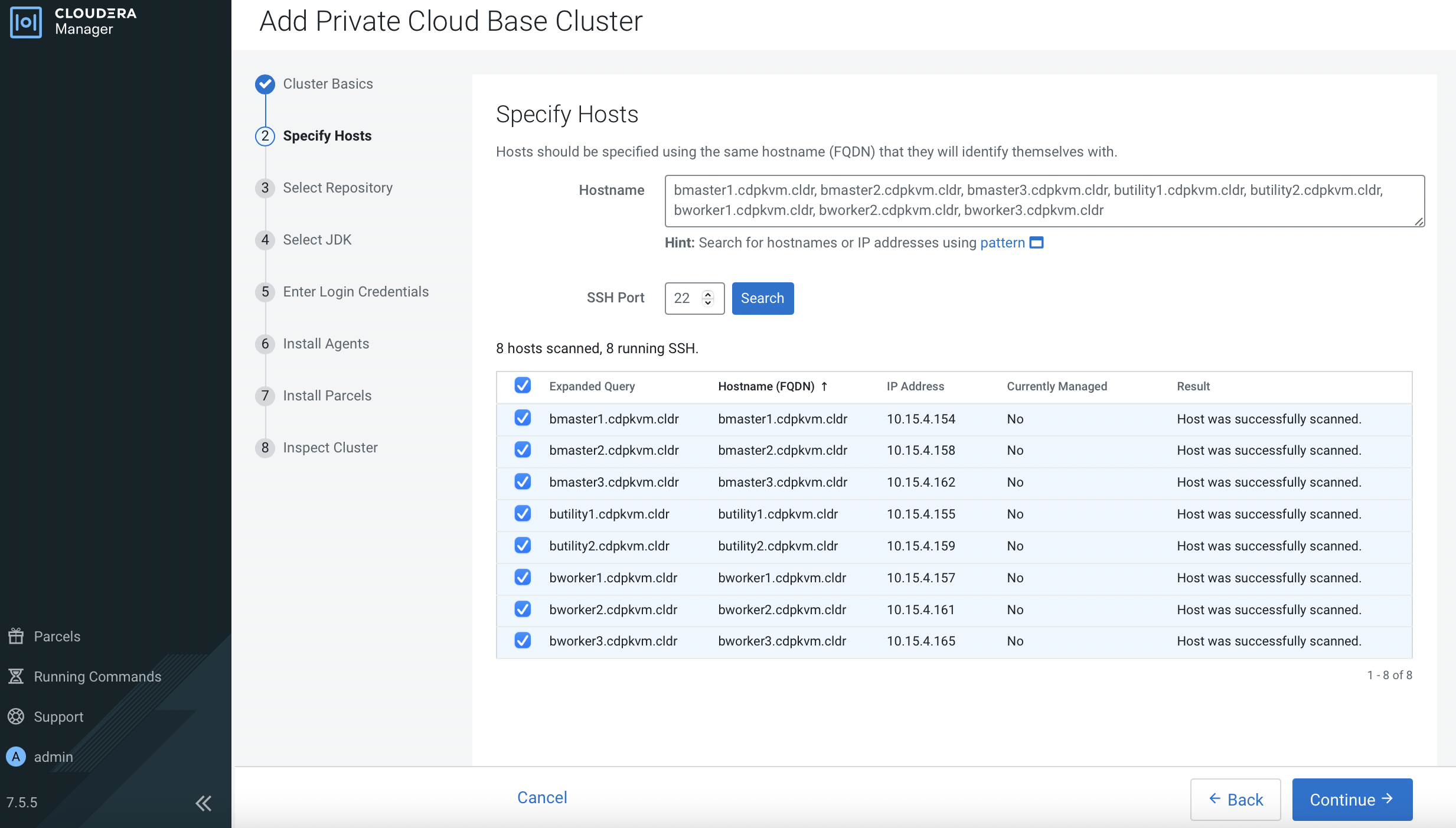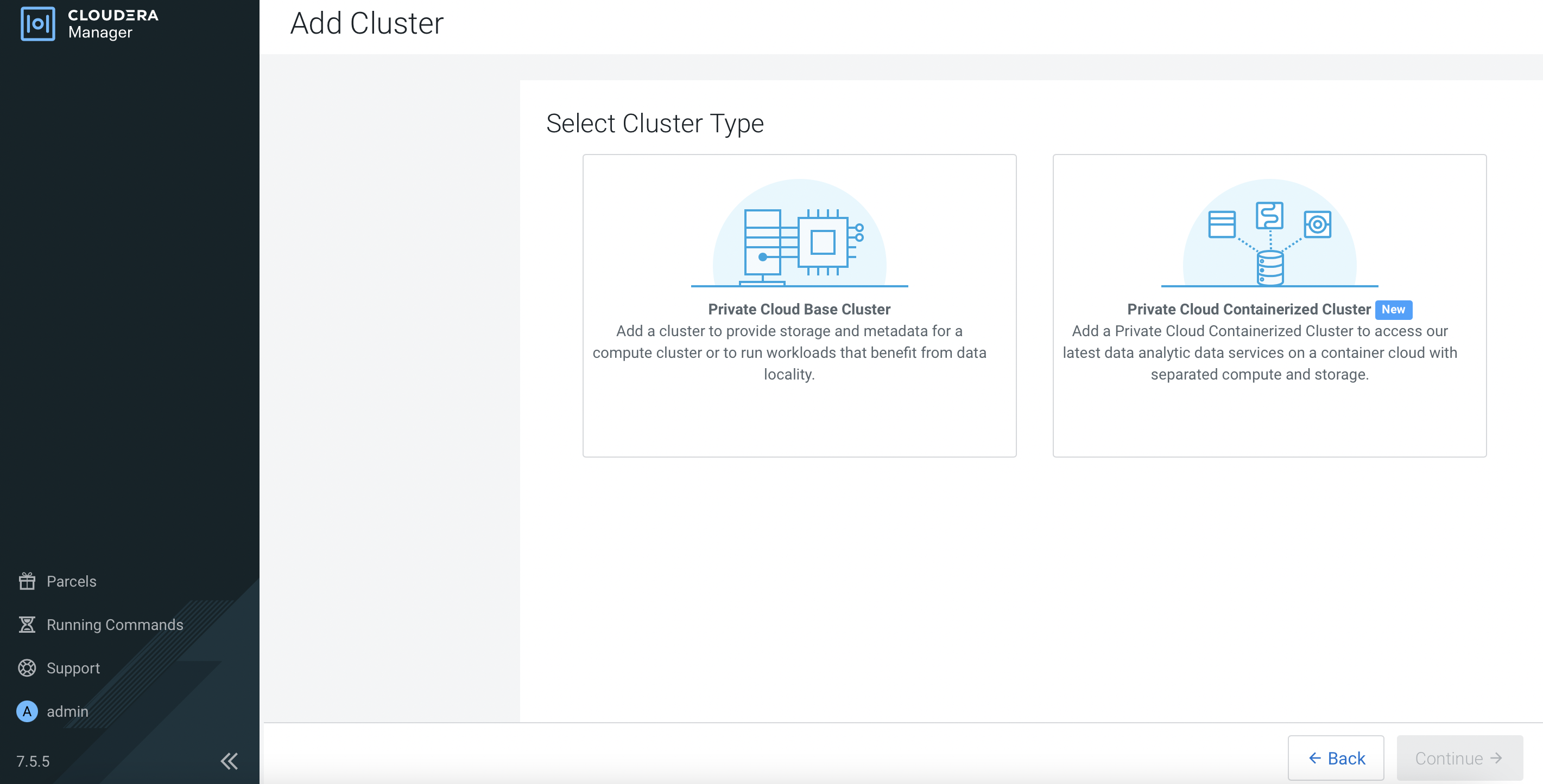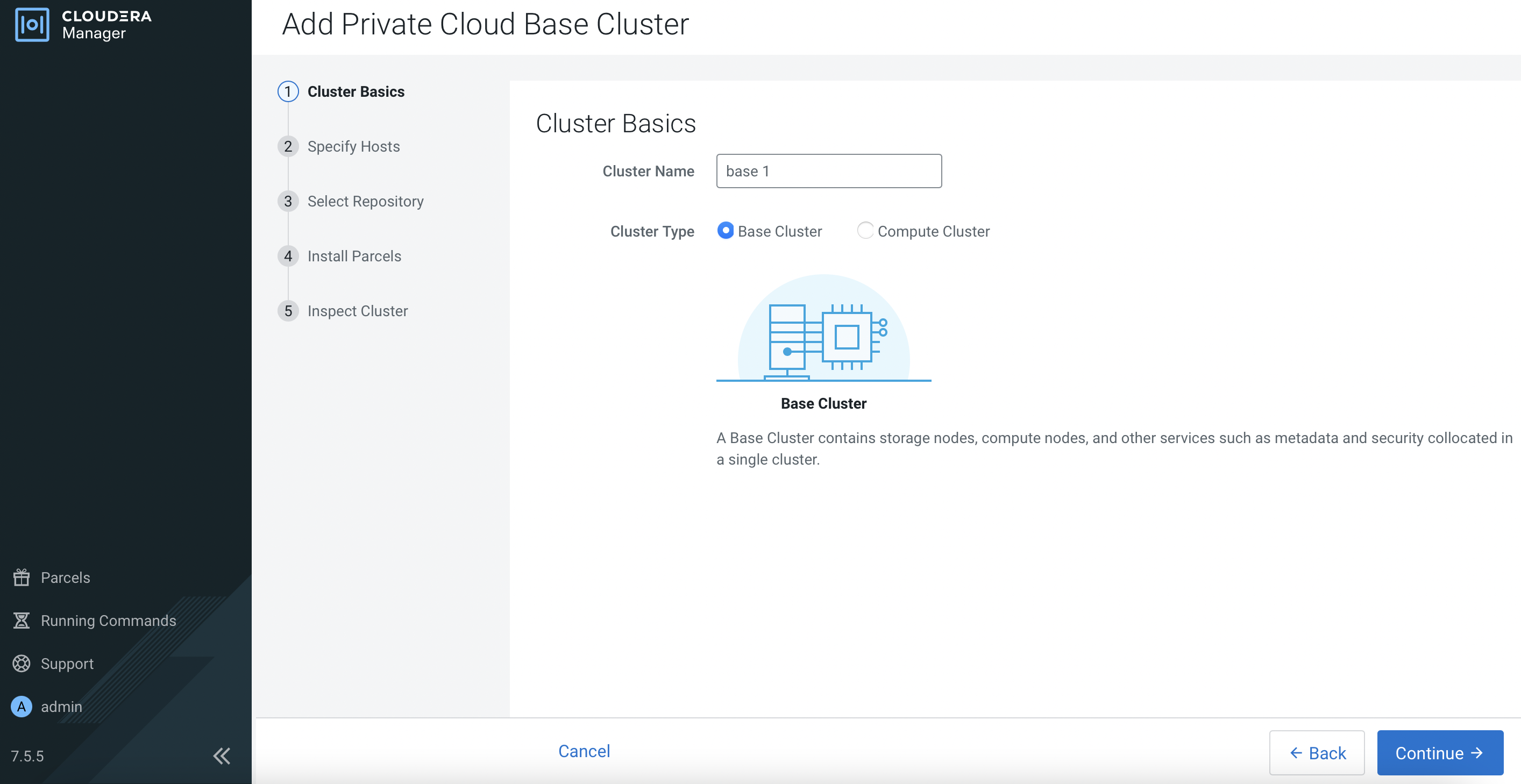 Clusters>Add Cluster. SelectPrivate Cloud Base Clusterand clickContinue.