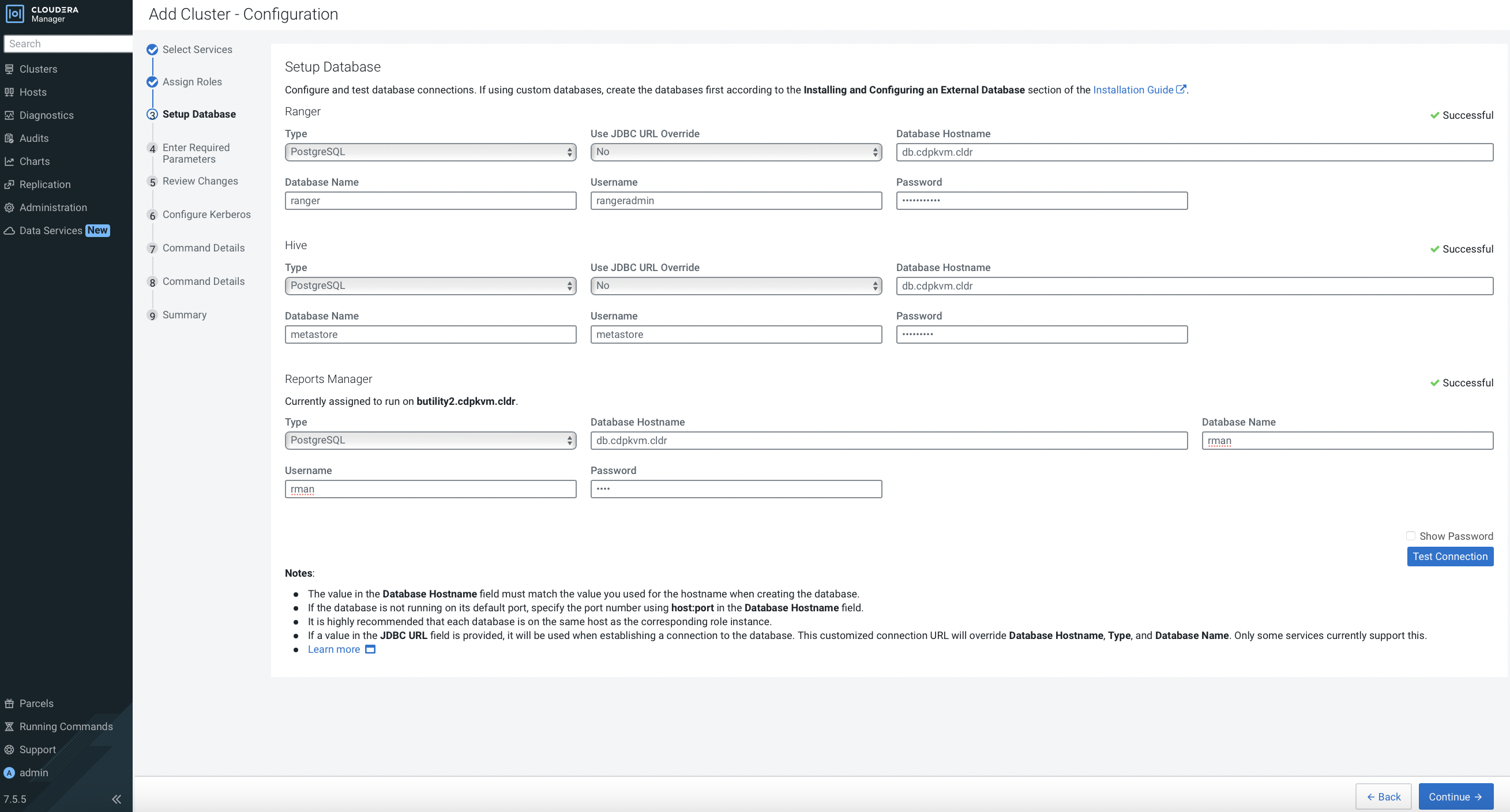 Fill in the database parameters based on the created databases in PostgreSQL. Click