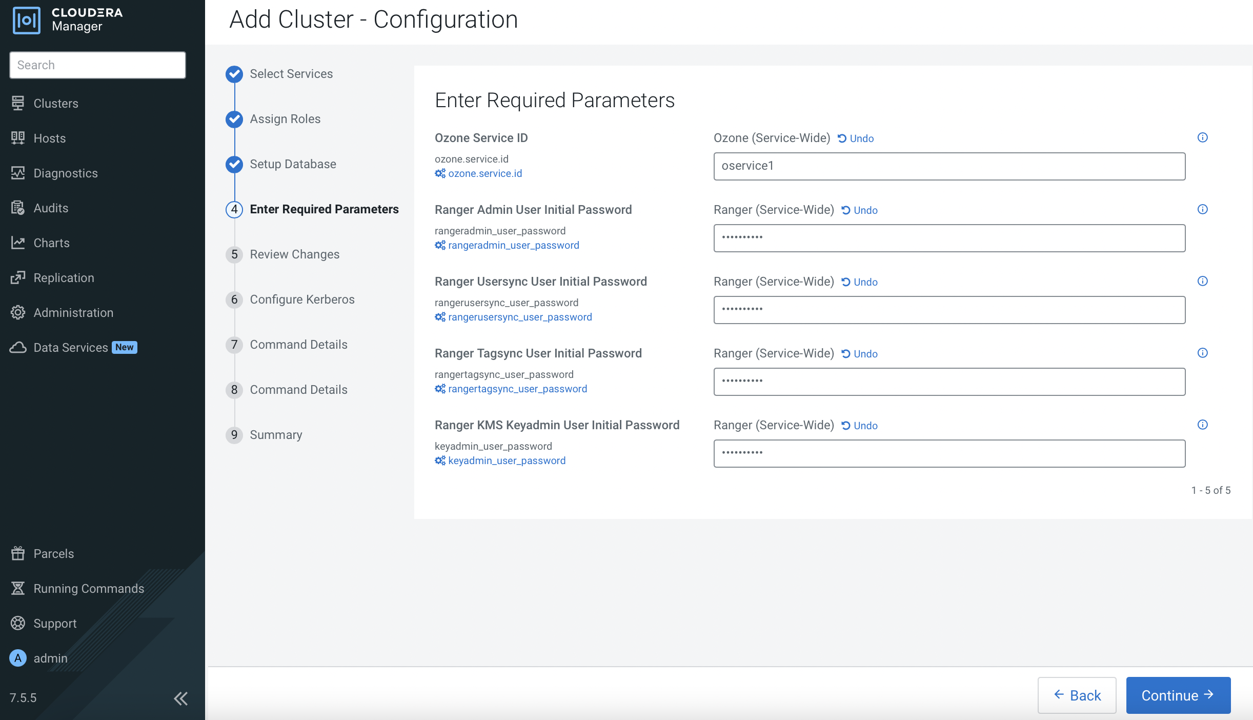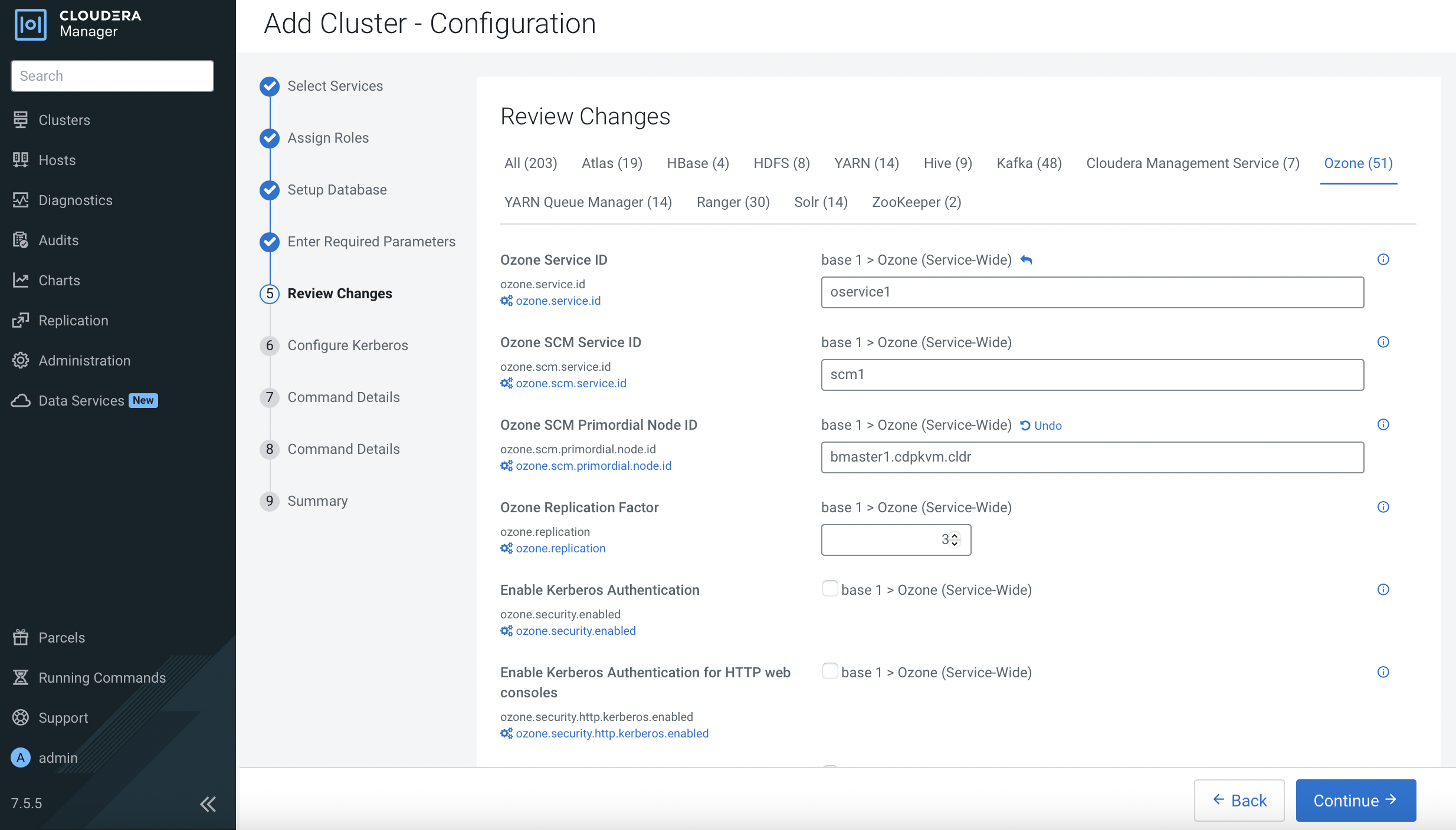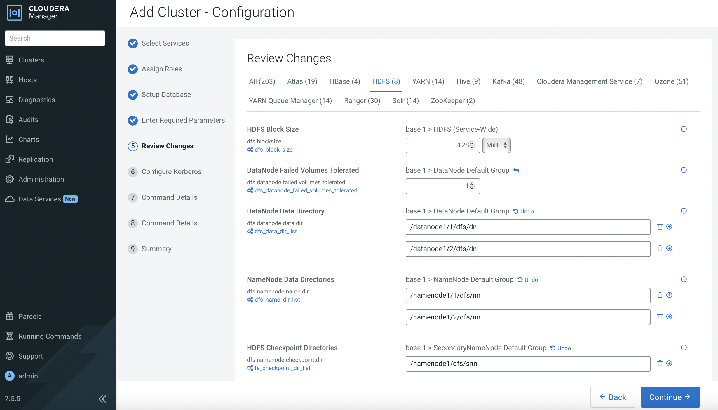 Review and amend the parameters accordingly. Note that the directory path for services such as HDFS, Ozone and Zookeeper might require dedicated storage disk that is expected to be formatted and mounted prior to this installation as explained in the prerequisites subtopic. The directory must be configured here in accordance to the mounted disk folder name.