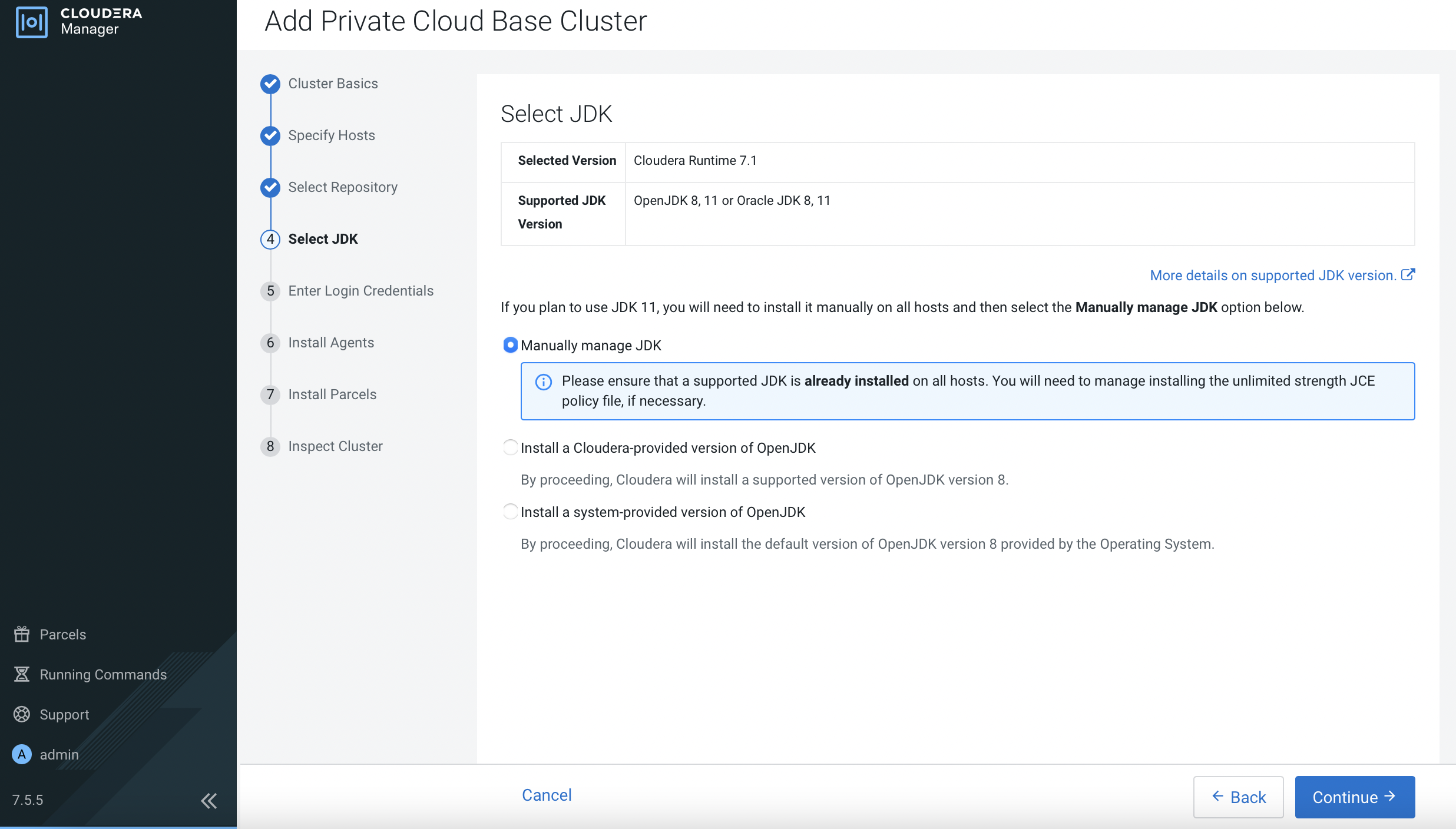 Ensure that JDK has already been installed in each CDP PvC Base host. Select
