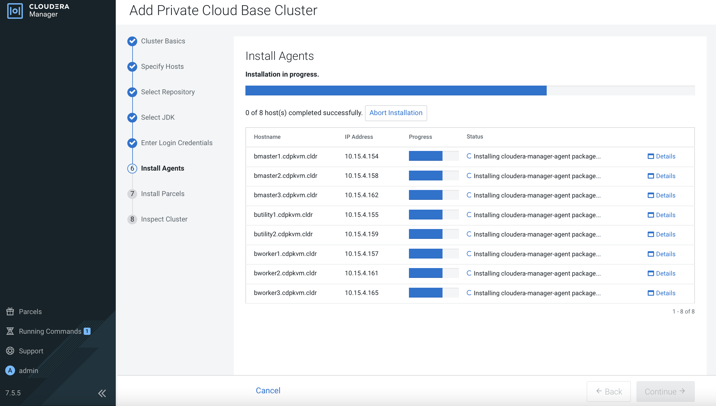 CM is installing the agent in each CDP PvC Base host in parallel and will subsequently install the parcels.