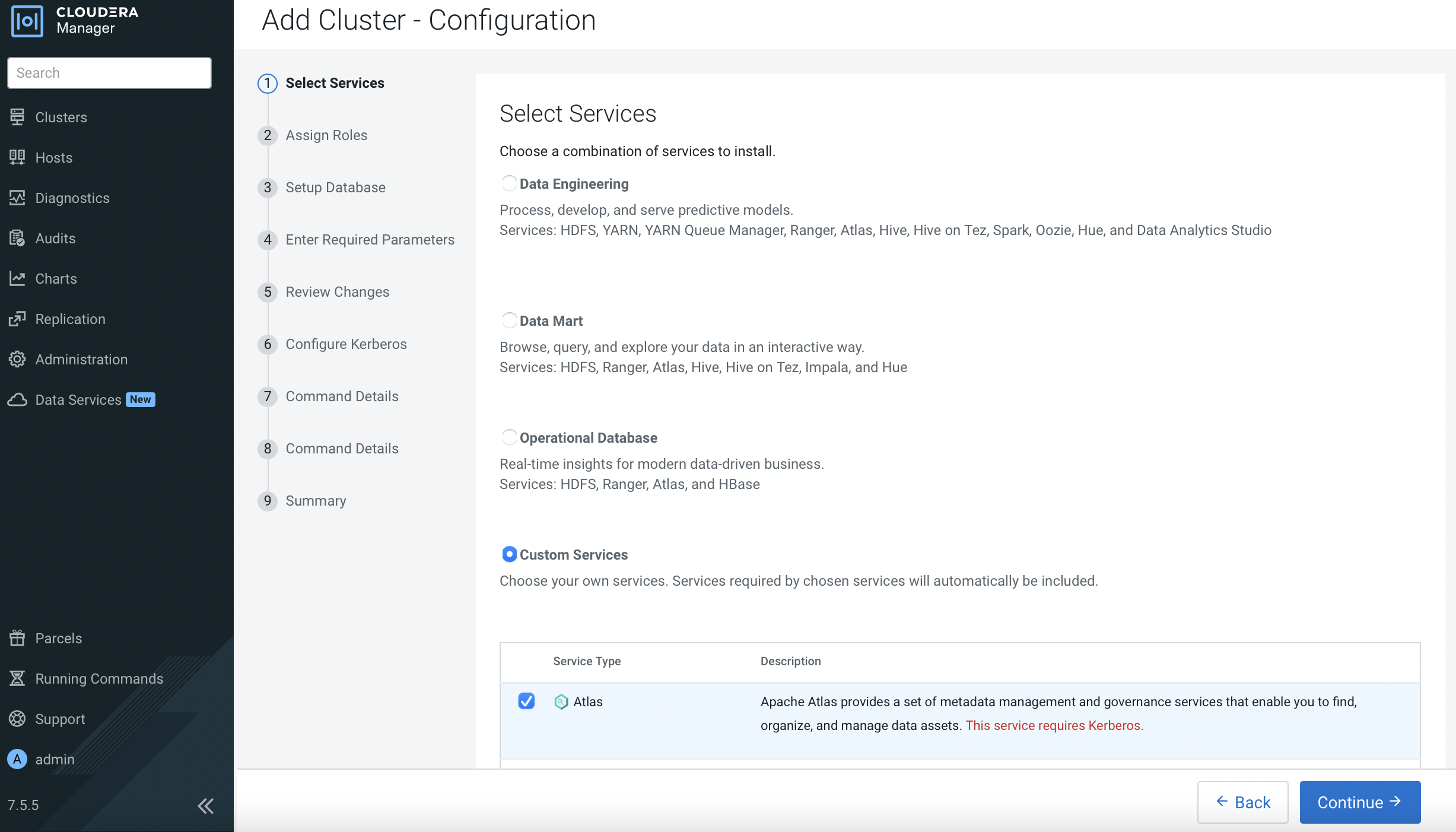 Custom Services. SelectAtlas,HDFS,Hive,Ozone,Ranger,Yarn,Yarn Queue ManagerandZookeeper. These are the minimum services needed on the CDP PvC Base cluster as the prerequisites to provision CDW, CML and CDE on Kubernetes platform later.