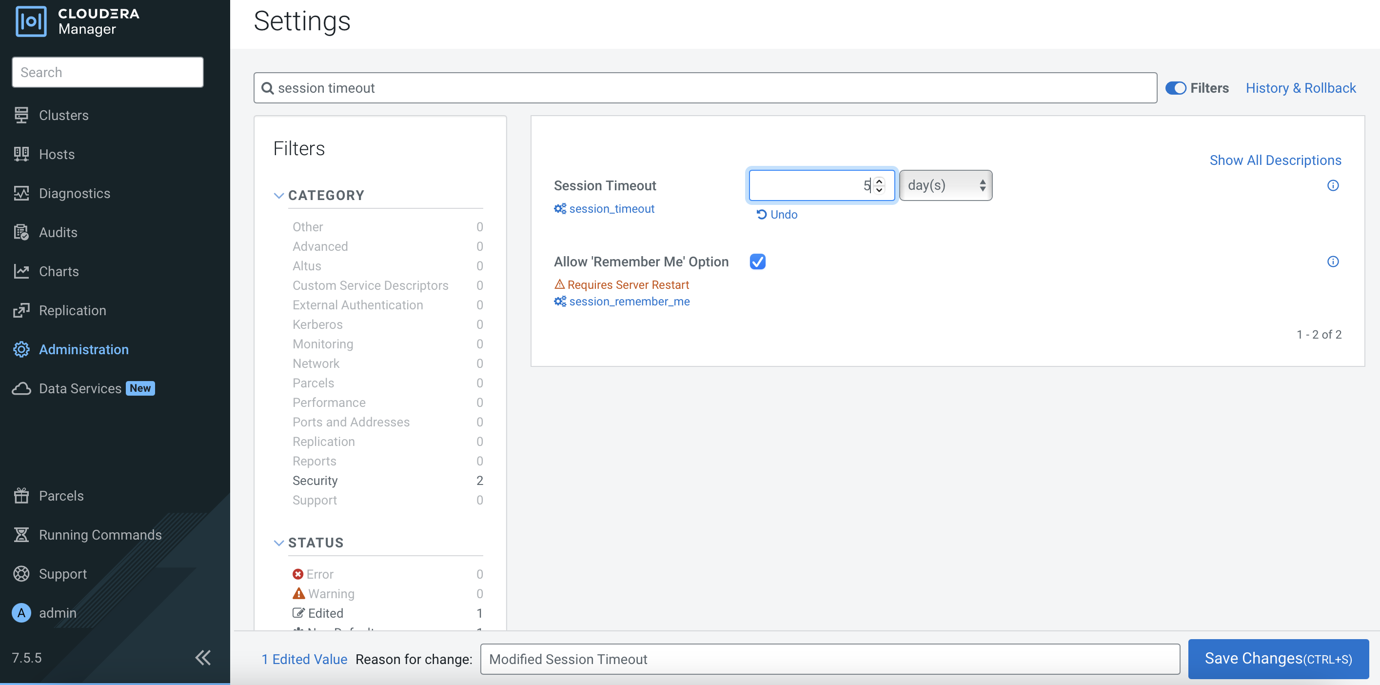 Administration>Settings. Search forsession timeout. Key in5 days. This is a temporary setting to avoid session timeout during CDP PvC Base installation (You may revert this setting after successful installation). Log out and log in CM portal.
