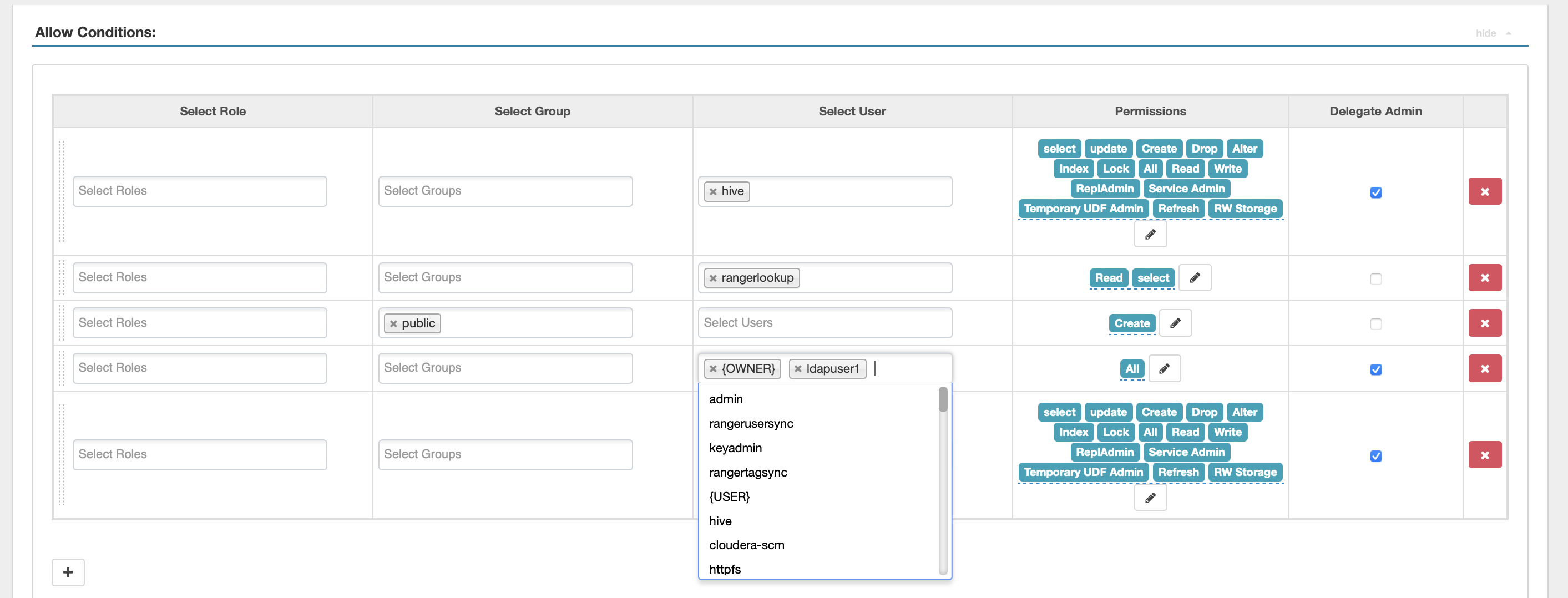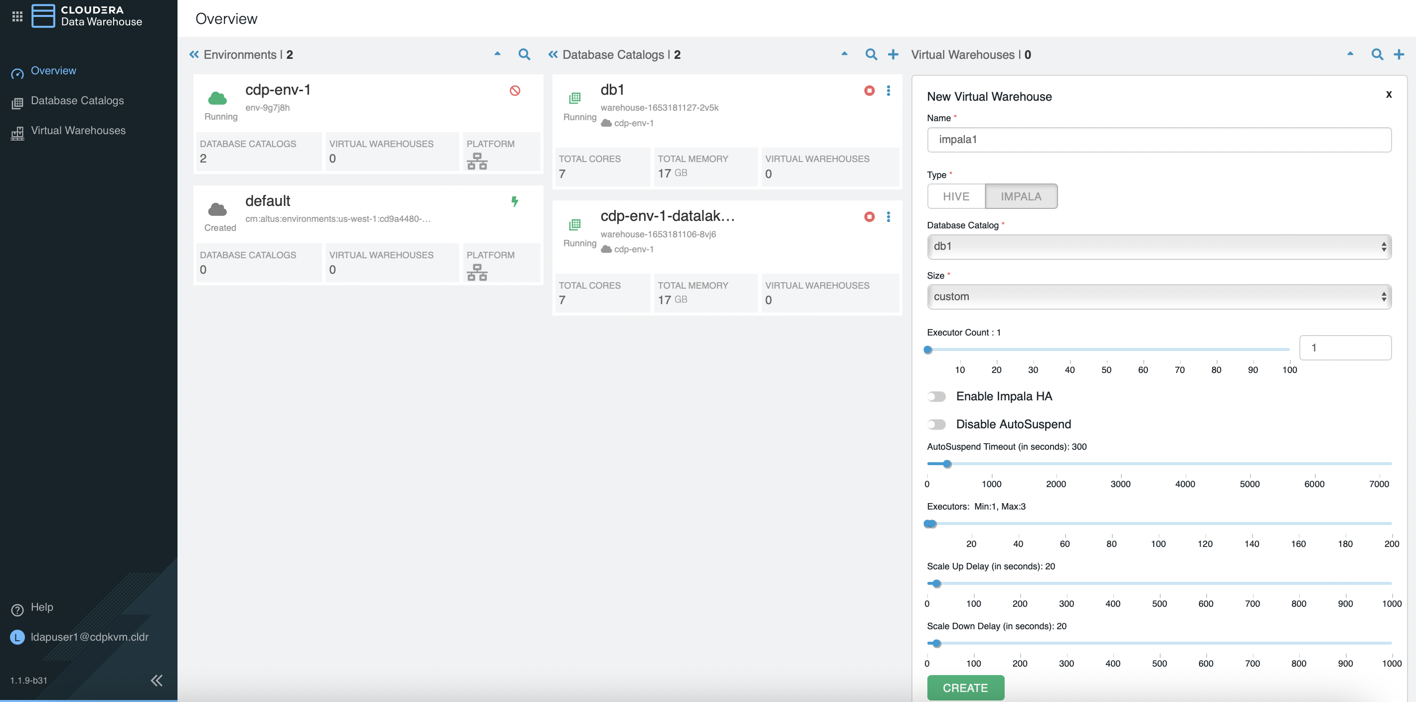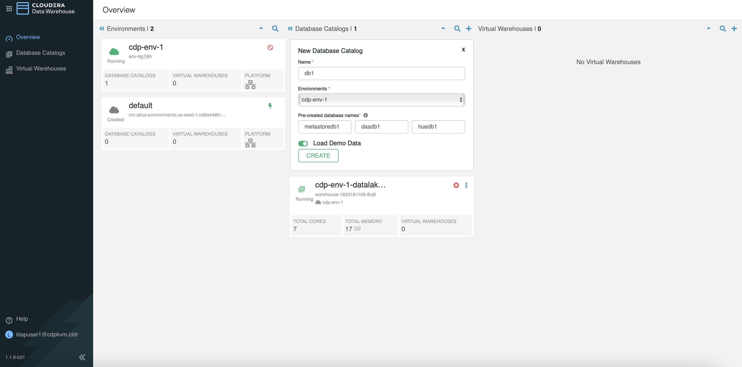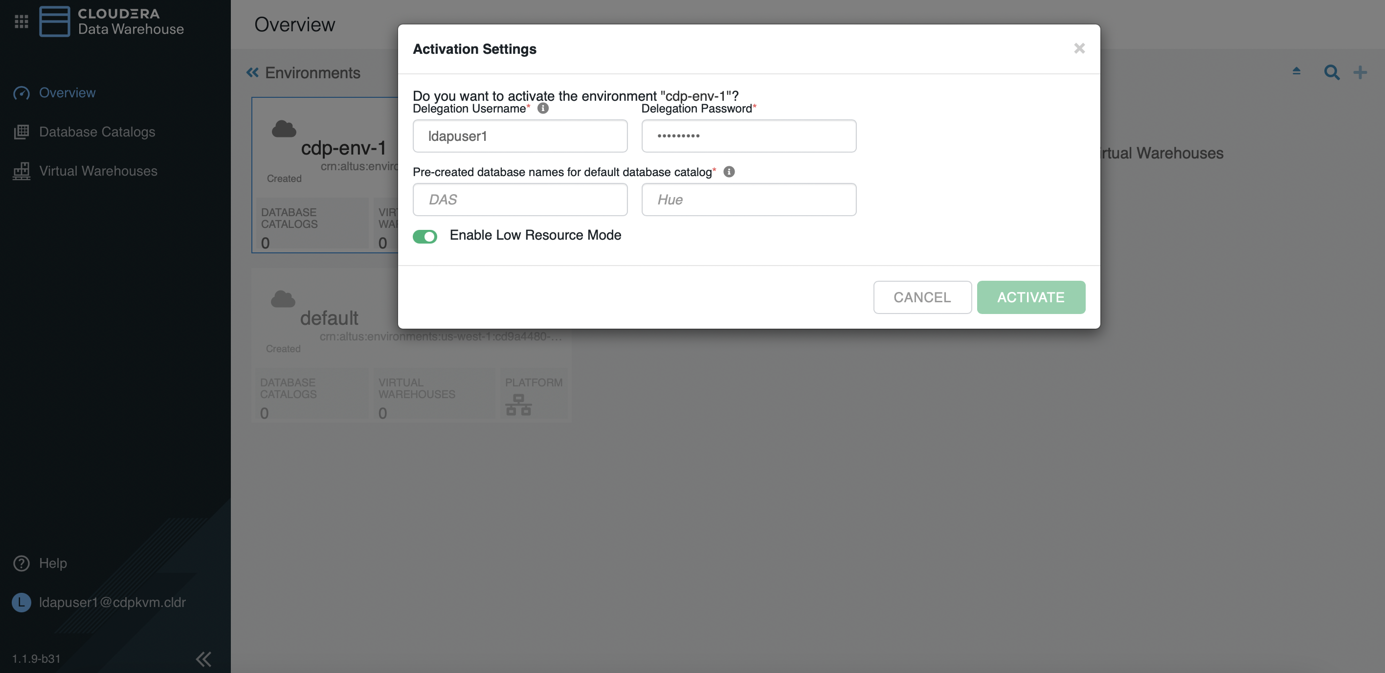 Click the thunder icon of the newly created data lake environment. Fill in the parameters using LDAP user credentials. Note that the databases must be pre-created as highlighted in the prerequisites topic.
