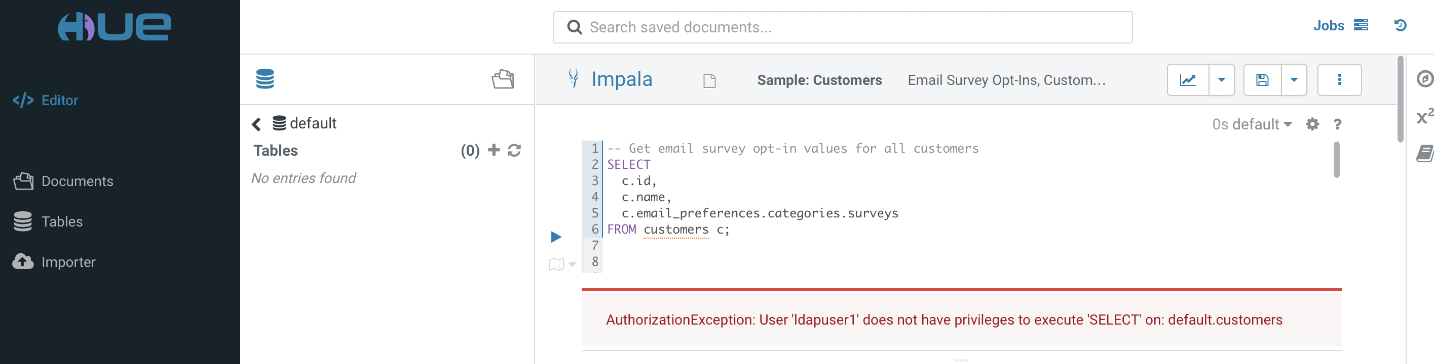 In Hue dashboard, rerun the same SELECT request on the default database. The result should no longer prompt the same "AuthorizationException" error.