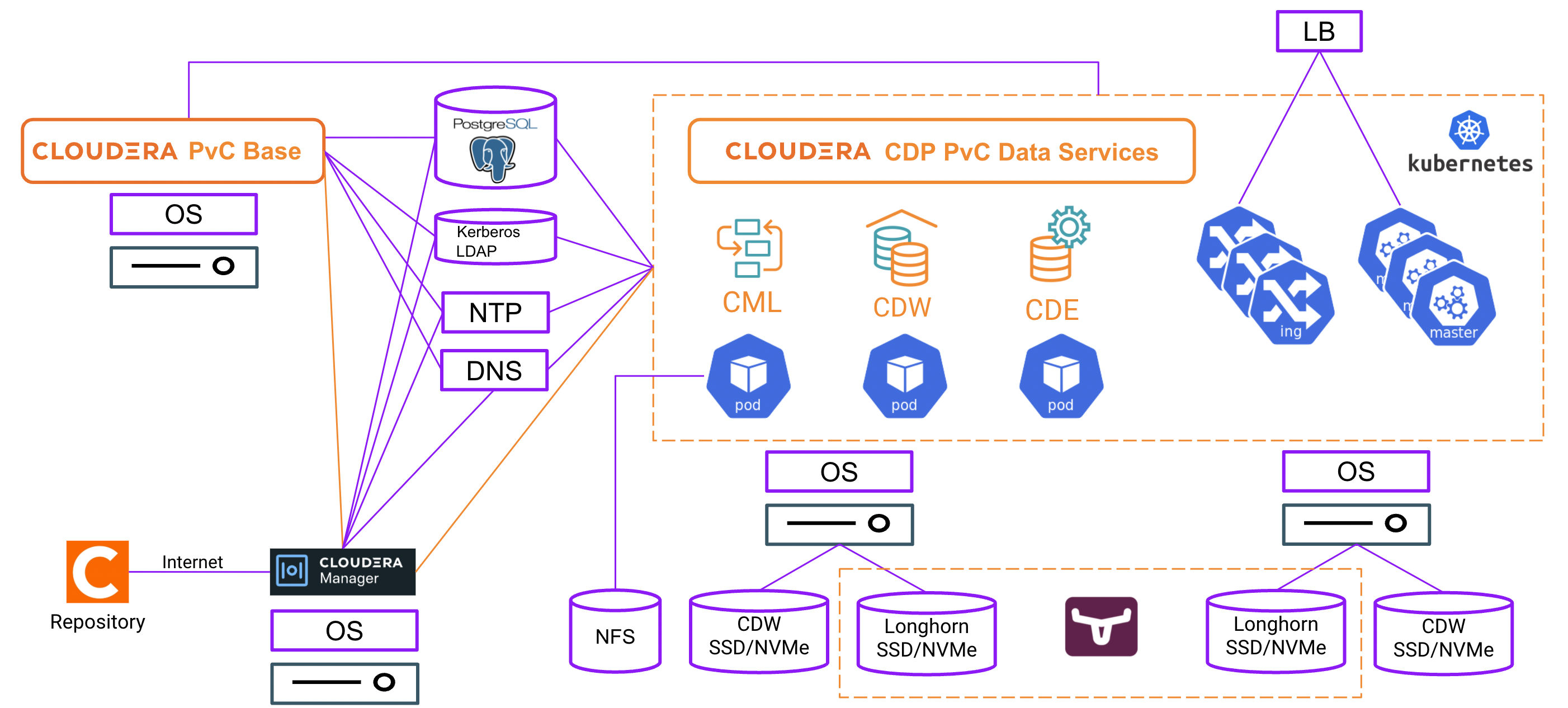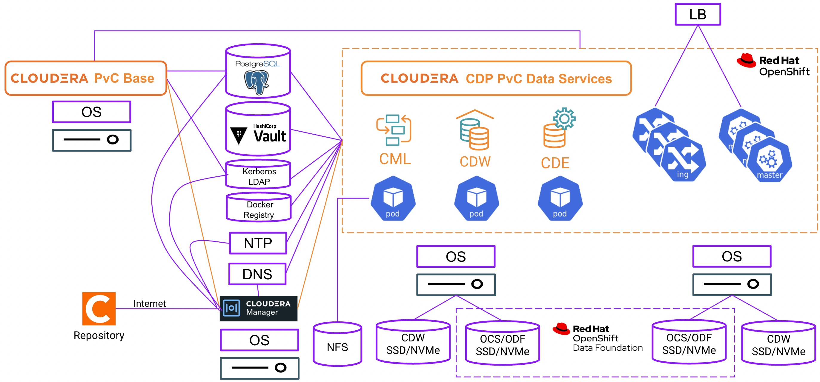For CDP Private Cloud solution with Openshift platform, the required external components are represented by the purple-coloured components as shown in the following diagram.