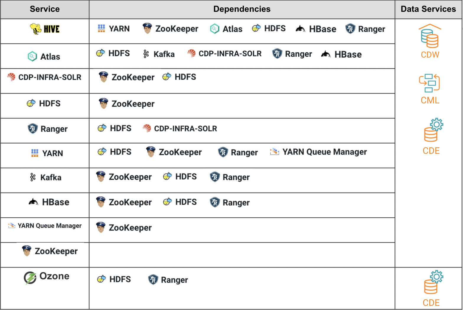 The minimum CDP PvC Base services and its dependencies to install CML, CDW and CDE are illustrated in the table below.