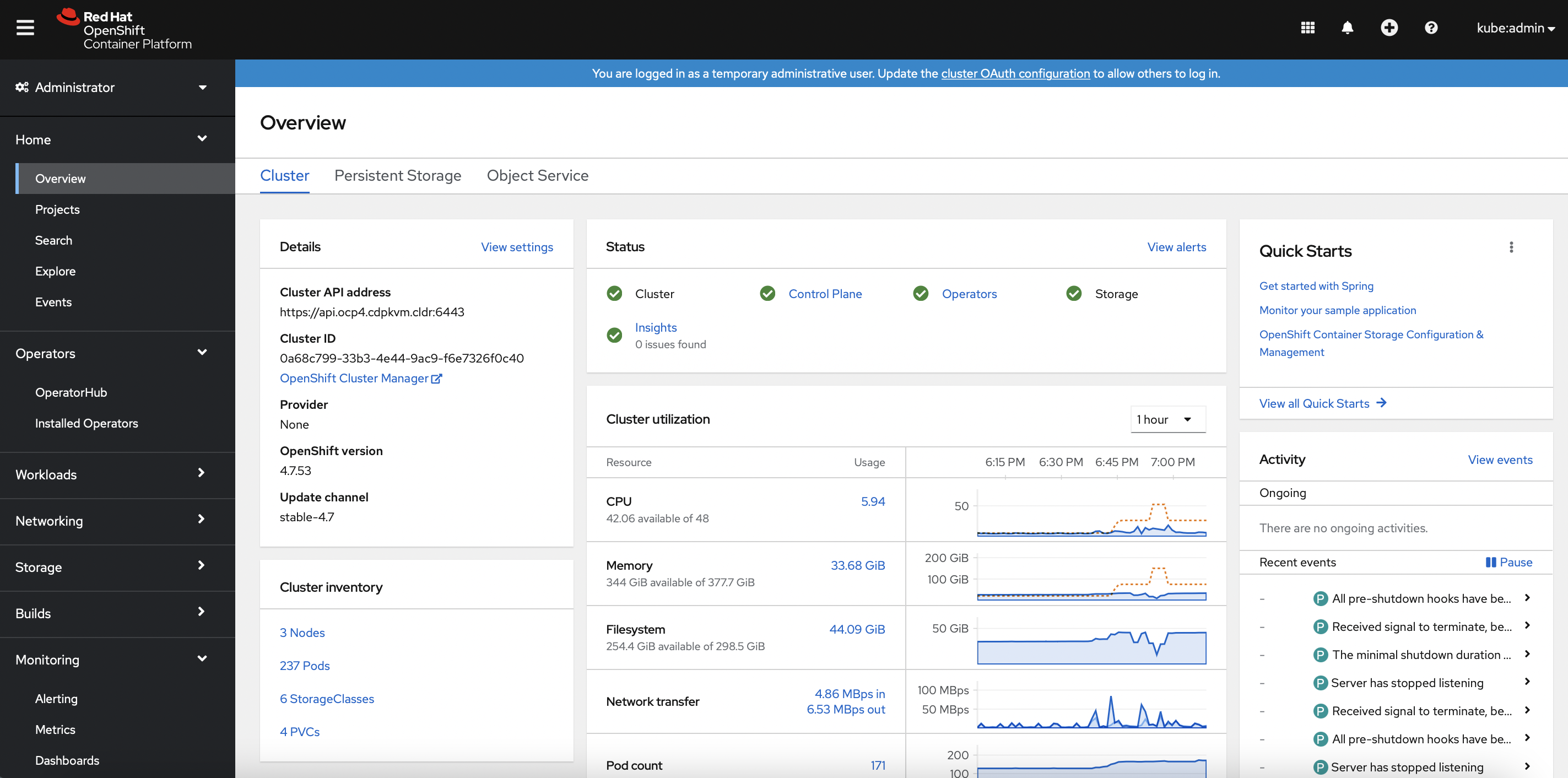The Openshift dashboard should reflect all components in green mode as depicted below.