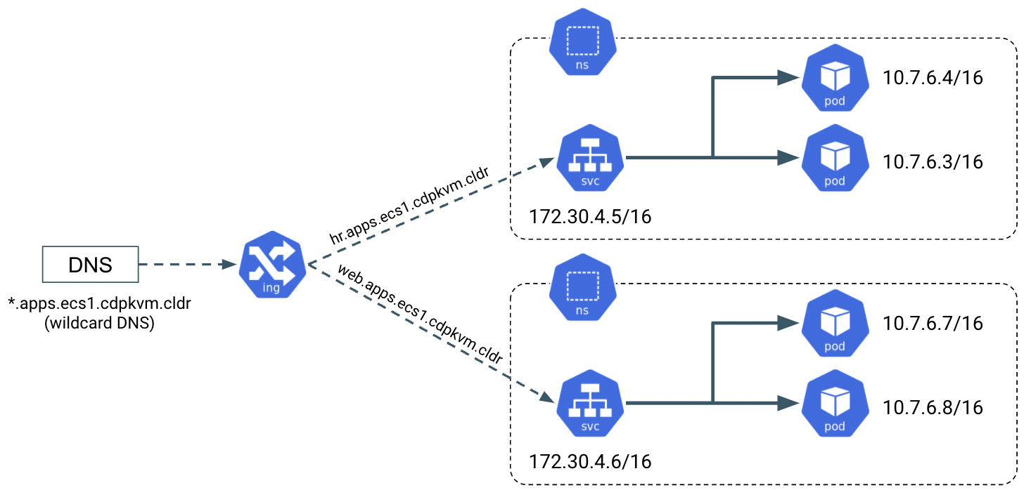 *.apps.ecs1.cdpkvm.cldr. This helps to reduce Day-2 operational task to set separate DNS entry for each newly provisioned external-facing application/service. -