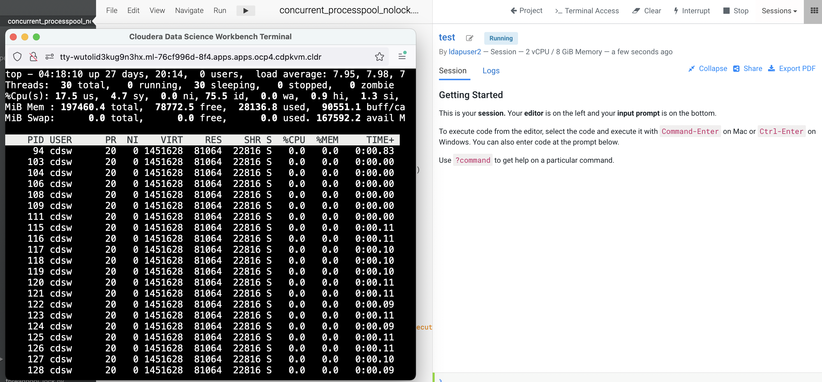 Terminal Accessbox and run thetopcommand to check the total threads are spawned by the process ID of the session pod. In this example, the process ID is 94. Note that there are 30 threads being opened by the process of this running session pod.$ top -p 94 -H