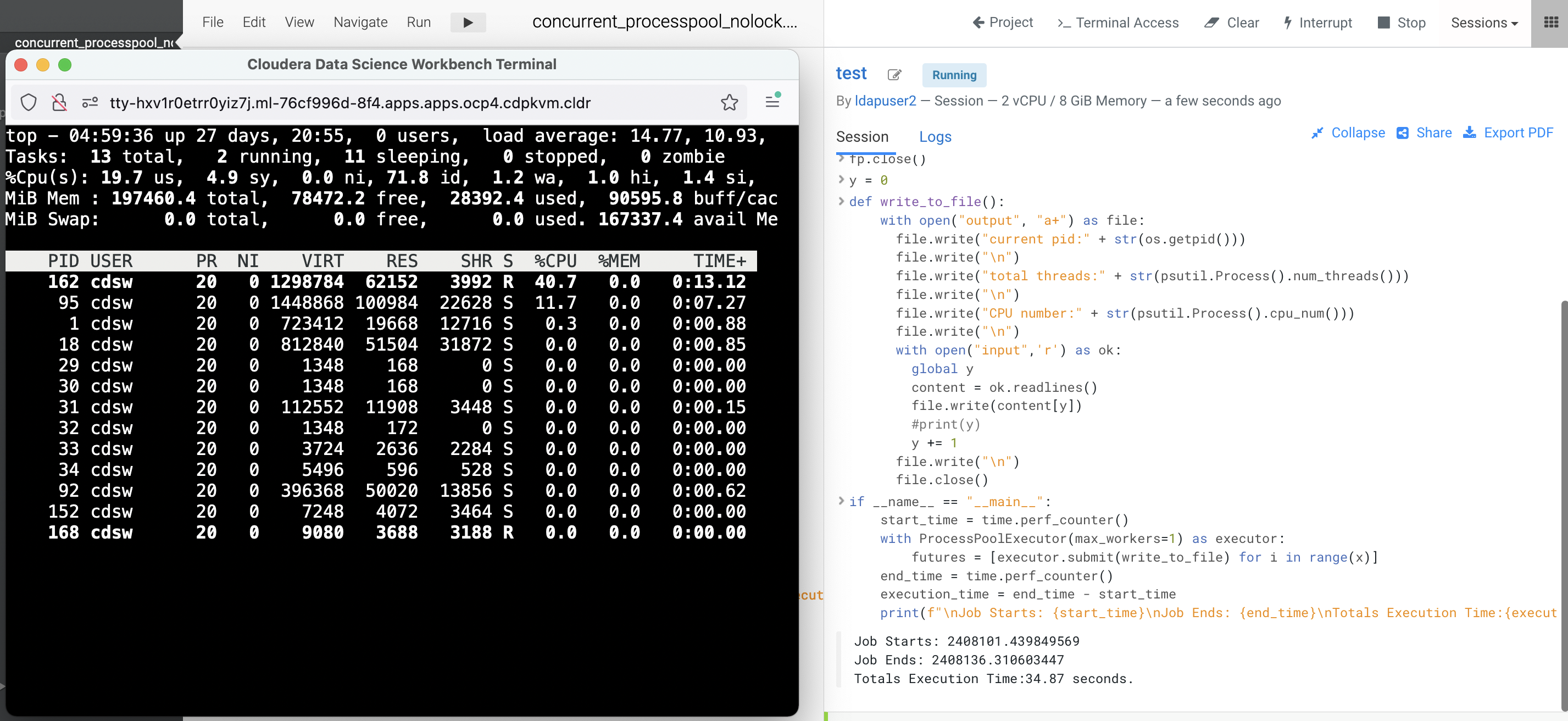 Observe the processing time taken by Python to run the code. Run a few times to ensure the result is consistent. In this case, it takes approximately 34 seconds with 1 worker to run the program.