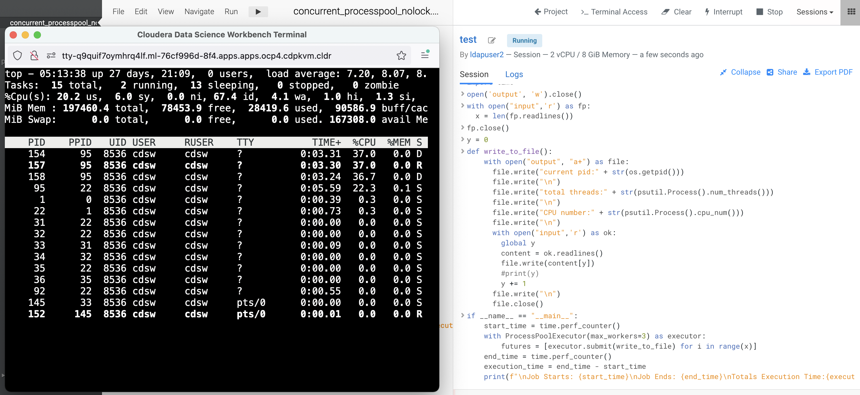 Conclusion: Although concurrent.futures.ProcessPoolExecutor is able to complete the program at a faster speed with more workers in place, the outcome of the output file fails to deliver the intention of the code. The line number is not written sequentially. This is the behaviour of race condition as a result of multiple processes writing into the same file in parallel. In other words, concurrent.futures.ProcessPoolExecutor is not thread-safe as tt creates a pool of processes to execute calls asynchronously. In a nutshell, while multiprocessing is able to use the available/allocated CPU cores to run multiple processes in order to reduce the completion time, it is not suitable for every use case especially CPU-bound and long running task.