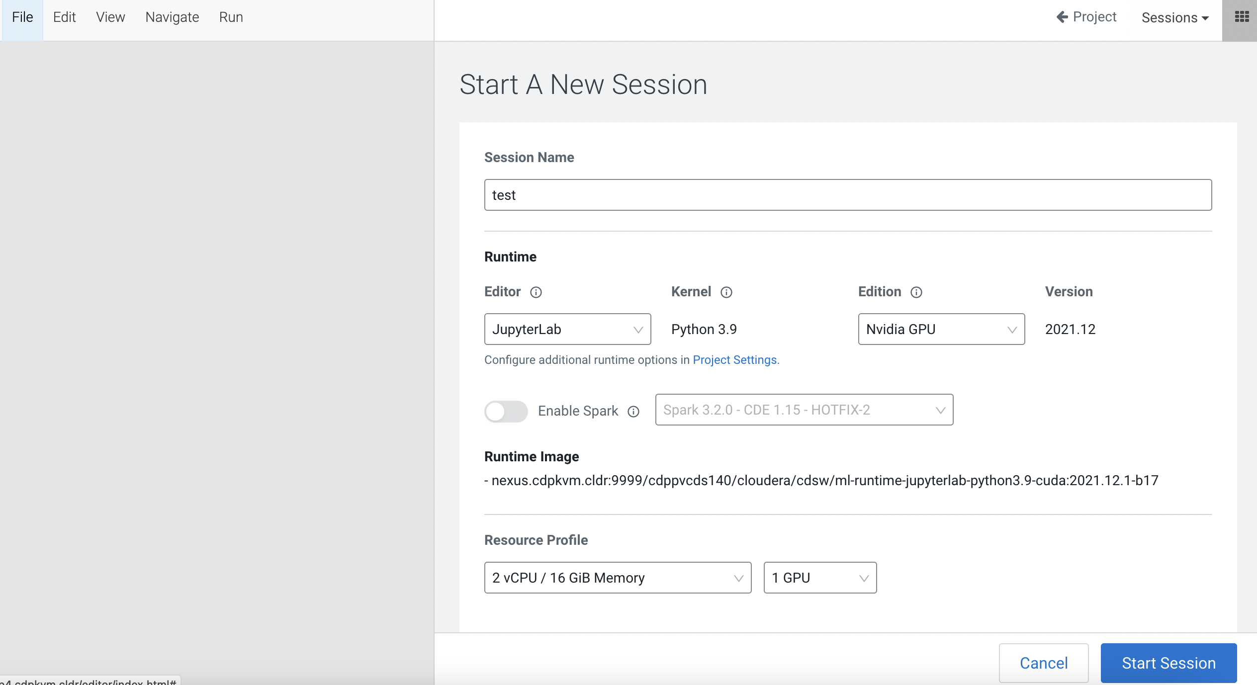 Create a CML Jupyterlab session with 2 CPU/16 GiB memory and 1 GPU profile.