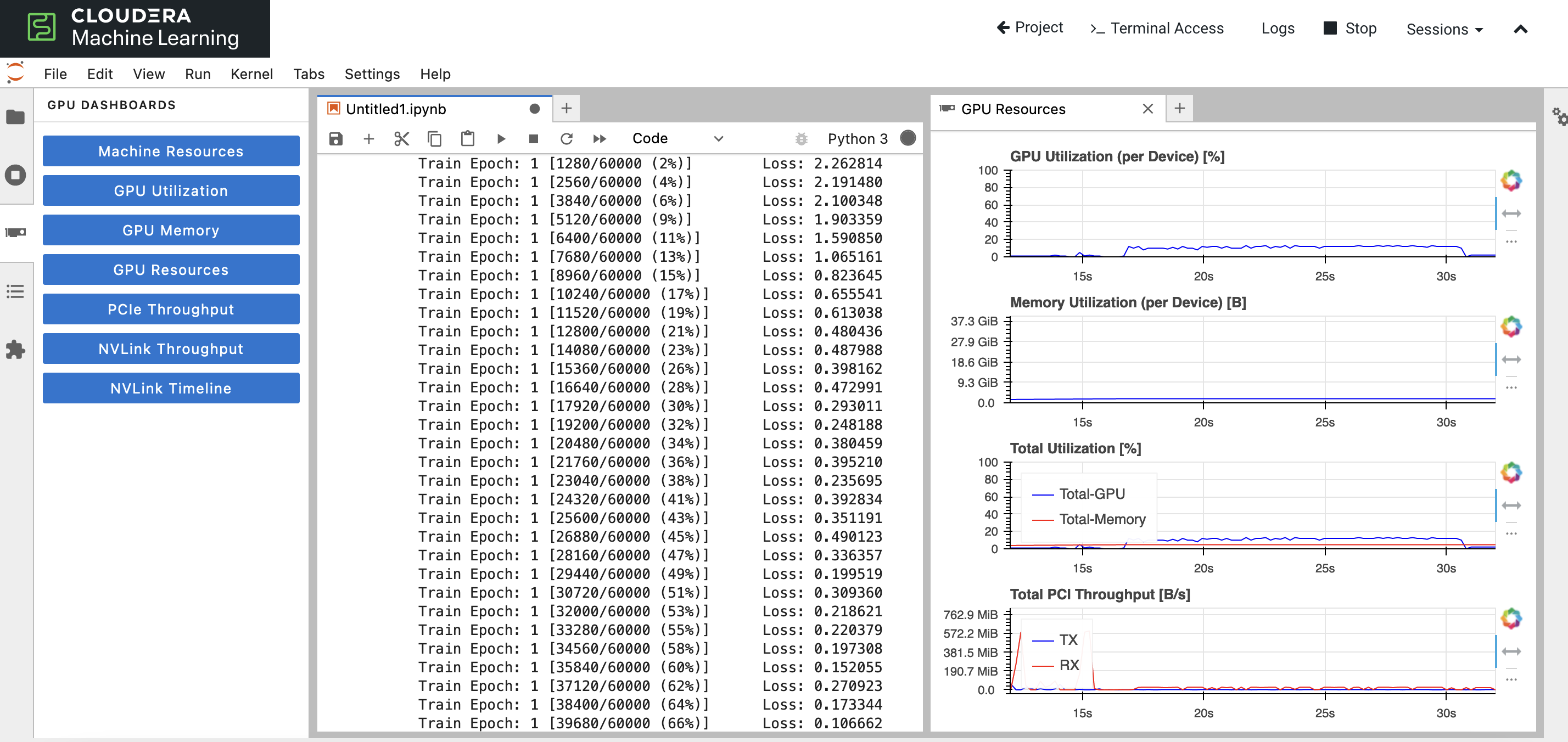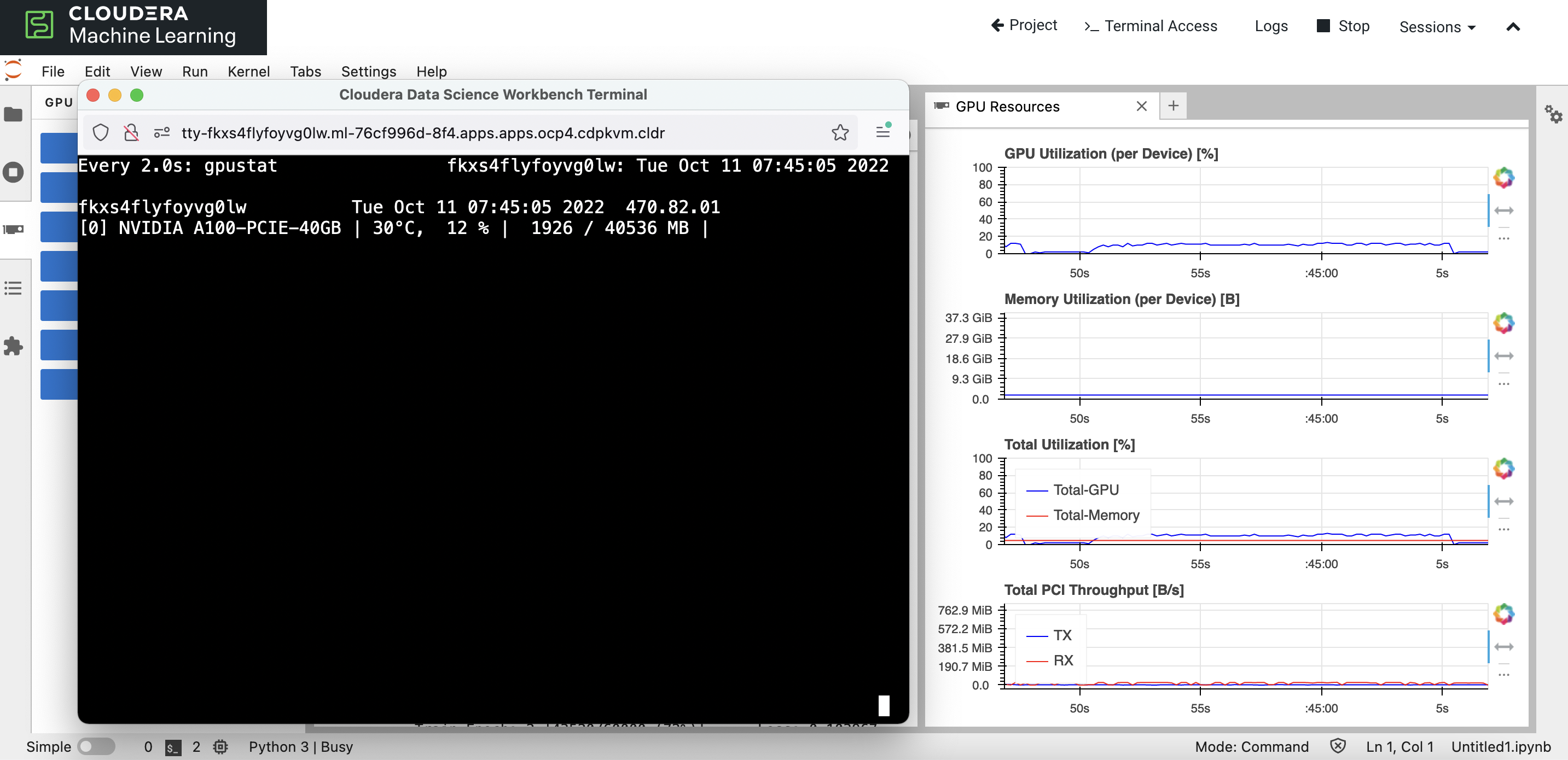 One might wonder why the system takes a long time to train a model using GPU. One of the possible reasons could be GPU card is not fully utilized to its maximum capability due to how the script/code is written. Question is how does one know if the GPU card is firing its cylinders to its full potential? Let's do an experiment using Cloudera Machine Learning (CML) on Kubernetes platform powered by Openshift 4.8. CML is embedded with workbench and Jupyterlab notebook IDE for data scientist to do coding, EDA, etc. The experiment makes use of Jupyterlab notebook to explore the performance output, e.g. whether the code is fully/under utilizing the allocated GPU resource.